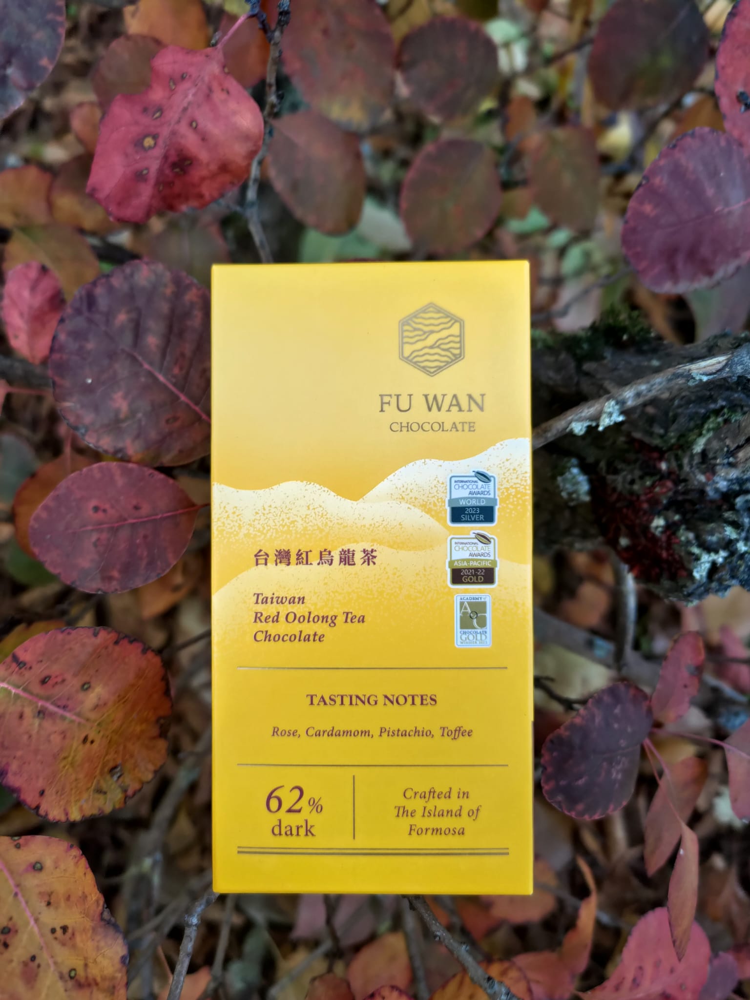Met Taiwan No. 1 62% chocolade als basis combineert het het sierlijke en elegante rozen-, kardemom- en geurige thee-aroma van zeldzame bergrode oolongthee, dat verandert in nootachtige tonen van pistache en amandel, en eindigt met een melksuikerafdronk. Het is het nieuwste meesterwerk van Fuwan’s theeserie pure chocolade, na de Tieguanyin, Ruby en Charcoal Roasted Oolong uit 2018.