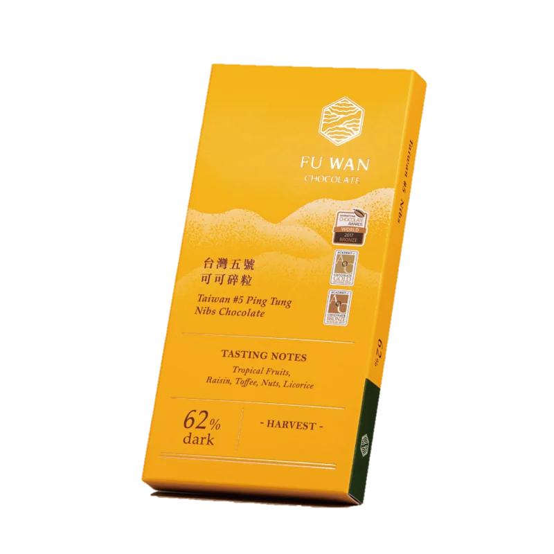 62% dark chocolates made from TREE TO BAR in Ping Tung , Southwest county of Taiwan. with notes of nuts, caramel, rum, licorice, and tropical fruit acidity, gentle and balanced. Cacao nibs sprinkle down it bring extra texture and fruity notes to the the chocolate.
